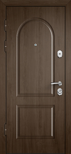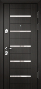 Древесные тона. Входная дверь темный дуб и входная дверь темный орех — универсальная классика под бежевые стены и тёплые полы. Дверь входная темный венге даёт максимальный контраст в светлом интерьере и хорошо поддерживается чернёной фурнитурой.
